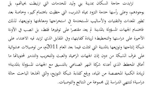 تزايدت حاجة السكان بمدينة بني وليد للخدمات التي ارتبطت بحياتهم، بل بوجودهم، وعلى رأسها خدمة التزود بمياه الشرب التي حظيت باهتمام كبير، وخاصة بعد تطور المعدات والتقنيات والأساليب المستخدمة في استخراجها ومعالجتها وتوزيعها، لذلك فاهتمام الجهات المسؤولة بالمدينة لم يعد مقتصرا على توفيرها فقط، بل انصب في الآونة الأخيرة على دراستها والتخطيط؛ لزيادة كفايتها، وفي المقابل الذي تزايد فيه الاعتداء على شبكة إنتاجها وتوزيعها بالمدينة التي تمثلت فيما بعد العام 2011م، من توصيلات عشوائية على غرف الشبكة من دون إذن الجهات الرسمية والعبث والتخريب والتدمير محتوياتها ما أعاق المخطط الذي أعدته شركة النهر الصناعي بالتنسيق مع الجهات المسؤولة بالمدينة؛ لزيادة الكمية المخصصة من المياه، ورفع كفاءة شبكة التوزيع، والتي اتخذها الباحث حالة دراسية؛ لتنتهي الدراسة إلى مجموعة من النتائج والتوصيات.